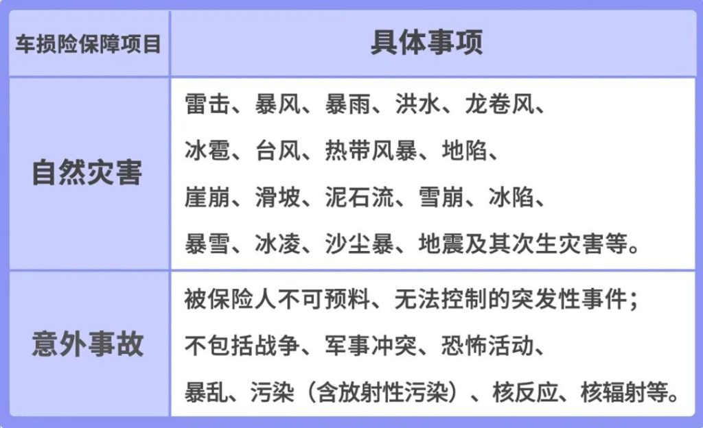 如冰雹、暴雨、洪水、地震等自然灾害来袭;外界物体倒塌或坠落、保险车辆行驶中平行坠落;火灾、爆炸等事故。